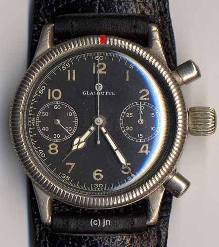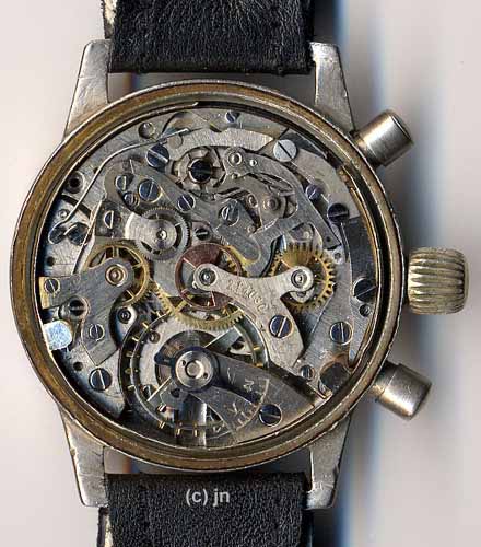 Kaliber 59 03sehr gut erhaltenes Original- Zifferblatt mit wahrscheinlich später aufgedrucktem Tutima-Logo, schönes vernickeltes Messing- Gehäuse, vernickelter Messingboden, spätes vernickeltes Werk in gutem Zustand (überholt) Zustand: 2